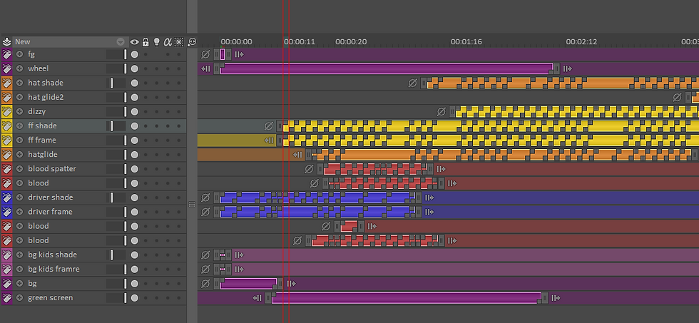 over the course of the project, i have come to grasp TV paint a lot more than when i had started, and allthouhg i would certainly not call myself a master as of yet, i do feel a lot more in tune with the software and what i can do with it. for example, heres a few interesting things i picked up that really helped or were major obstacles as i went along