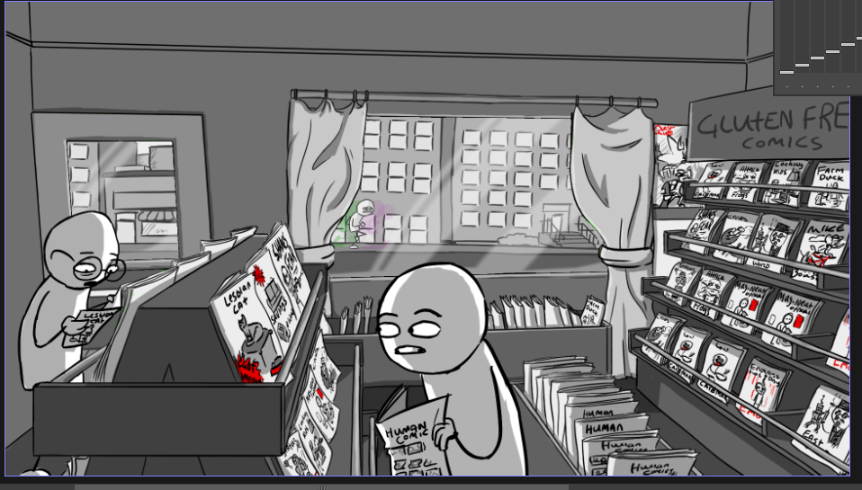 this comic book store is a perfect example of how i tried to accomplish visual humour with sight gags