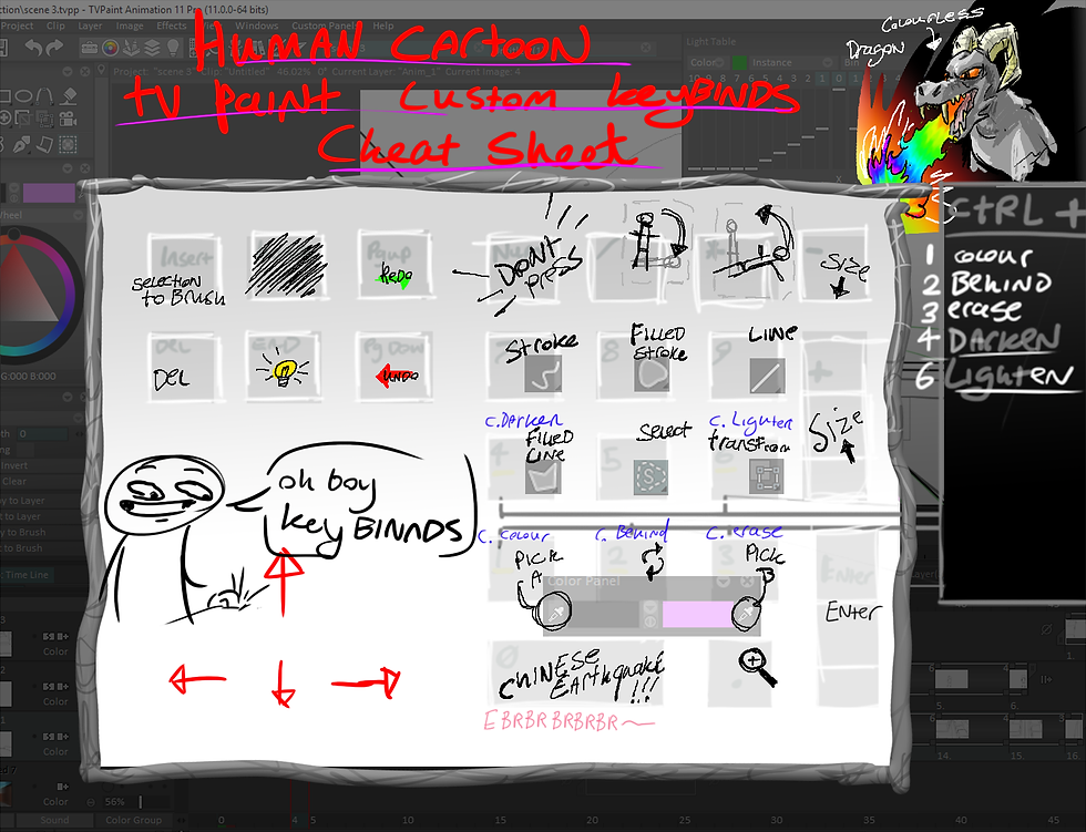 alright, so keybindings mate this process of animating a hell'uv a lot faster to get through. i mapped out all the tools that would be using to the keyboard so i could quickly switch between tools, or brush modes by holding ctrl to give you an example opf how much this actually cut down, i timed myself undoing then re-doing a brush stroke i mean i could hit the undo button on Tv paints interface but that can take around 17 seconds, whereas assigning the keys to "page up" and "page down" became a massive timesaver, aswell as a very handy tool for keeping my drawings "correct"